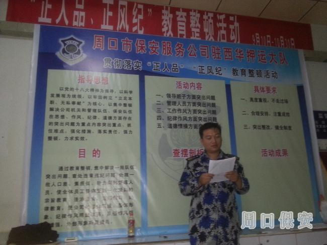 為落實公司“正人品、正風(fēng)紀(jì)”教育整頓計劃,9月23日上午,周口市保安服務(wù)公司西華押運大隊組織召開了教育整頓活動動員會。