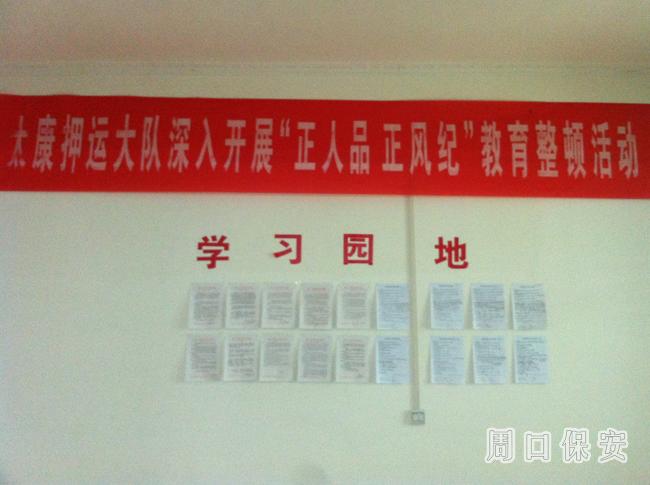 公司教育整頓實施方案出臺后,太康押運大隊長張海亮高度重視,迅速召開全體會議,傳達學習公司文件精神,廣泛深入動員。懸掛條幅,制作學習園地,造成聲勢,形成氛圍.。