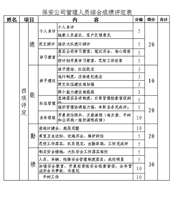 3.保安公司管理人員考核德能勤績四項(xiàng)成績評定表