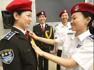 看到2006式保安服非常搶眼,紅色蓓蕾帽、紅色領(lǐng)帶、白色襯衣、咖啡色服裝、閃亮的帽徽、肩章……與以往的以深灰色為主的保安服和大沿帽相比看起來(lái)更精神。