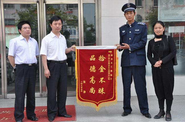 事情經(jīng)過還是要回到幾天前,4月29日下午,家住西華縣城的張先生由于家中蓋房,就到工商銀行西華分行取了三萬(wàn)元現(xiàn)金,在即將走出銀行大門口時(shí),由于不慎,丟掉一萬(wàn)元現(xiàn)金,而丟錢時(shí)張先生卻全然不知,當(dāng)時(shí)在工行大廳值班的保安隊(duì)員張勇在大廳巡視時(shí),忽然發(fā)現(xiàn)地上丟失了一疊現(xiàn)金,而失主卻又不知所向,此時(shí),張勇首先撿起丟失的現(xiàn)金,隨即與銀行保衛(wèi)部門取得聯(lián)系,講述了事情的經(jīng)過,并與銀行部門一同尋找失主,通過抽調(diào)監(jiān)控錄像和電話查詢,終于在下午聯(lián)系到了失主,并把錢歸還給失主。當(dāng)失主接到失而復(fù)得的現(xiàn)金時(shí),一直激動(dòng)地說:“真沒想到,太謝謝你們了,,,,,,”并送來(lái)了一面刻有拾金不昧、品德高尚的錦旗以表感激之情。
