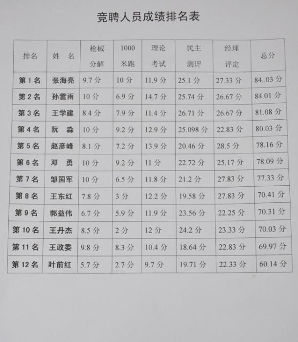 在公司綜合部門和督察部門的努力下,對(duì)所有競(jìng)聘人員的各項(xiàng)考試成績(jī)進(jìn)行了匯總和排列,并與14日進(jìn)行了張榜公布,最終,參加競(jìng)聘人員張海亮、孫雷雨、王學(xué)建分別以優(yōu)異成績(jī)?nèi)〉么舜胃?jìng)聘的前三名。