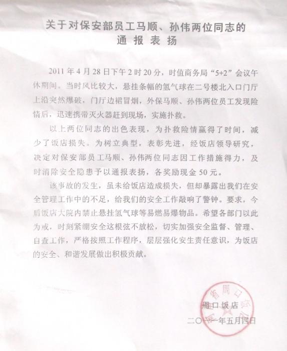 2011年4月28日下午2時(shí)20分,保安公司駐周口飯店執(zhí)勤崗點(diǎn)馬順、孫偉兩位員工發(fā)現(xiàn)周口飯店門(mén)口懸掛條幅的氫氣球在二號(hào)樓北入口門(mén)廳上沿突然曝破,當(dāng)時(shí)風(fēng)較大,門(mén)廳邊裙冒煙,見(jiàn)此危急情形,兩位保安員迅速攜帶滅火器趕到現(xiàn)場(chǎng),實(shí)施撲救,并及時(shí)向有關(guān)領(lǐng)導(dǎo)匯報(bào)情況。