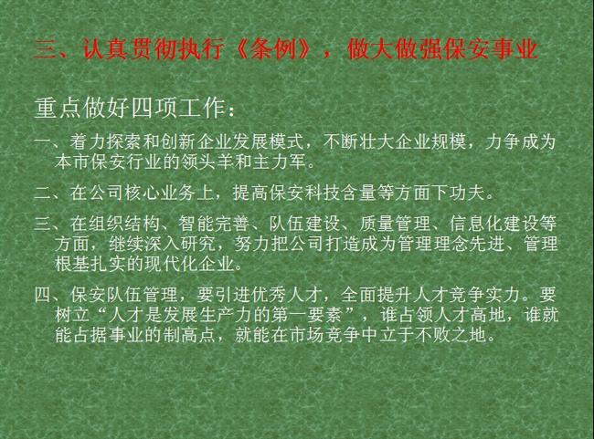 教育課上,朱振年同志向大家詳細(xì)講述了為什么要制定《保安服務(wù)管理條例》以及《保安服務(wù)管理條例》的主要內(nèi)容,并且結(jié)合公司開展“四知”教育活動,號召大家認(rèn)真貫徹執(zhí)行條例,做大做強保安事業(yè)。最后,朱振年同志深情地向大家講到:相信公司在市公安局的領(lǐng)導(dǎo)下,在韓總的帶領(lǐng)下,通過“四知”教育活動,堅持科學(xué)發(fā)展觀,員工的政治業(yè)務(wù)素質(zhì)會更加提高,團結(jié)更會加強,凝聚力就更高,單位工作一定會爭先奪冠,整體工作持續(xù)攀升,公司一定能發(fā)展、鞏固、規(guī)范,做實、做大、做強。希望全體員工要團結(jié)一致,共同努力,把周口市保安服務(wù)公司的業(yè)務(wù)做大做強,為構(gòu)建周口保安大廈而努力奮斗。