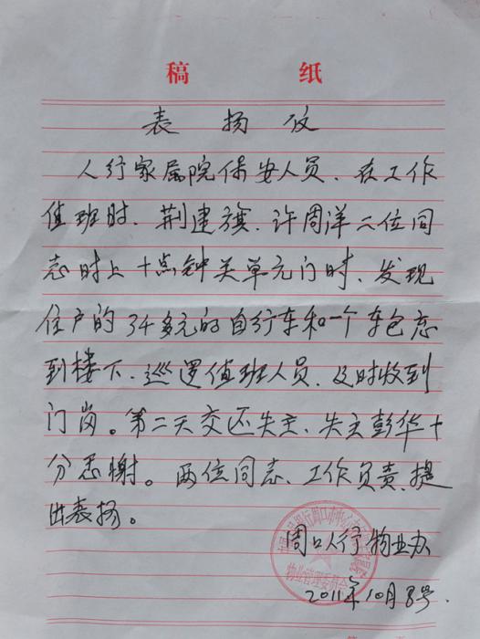 2011年10月5日22:00時(shí)左右,周口市人行家屬院保安執(zhí)勤崗點(diǎn),值班保安荊建旗、許周洋兩人在巡邏到六號(hào)樓三單元時(shí),發(fā)現(xiàn)一輛自行車(新賽車)沒有落鎖,而且車前框內(nèi)落下一個(gè)皮包,皮包內(nèi)裝有現(xiàn)金、手機(jī)、銀行卡、票據(jù)等物品,兩人及時(shí)把車鎖好,把包內(nèi)物品妥善保管好,將情況向上級(jí)領(lǐng)導(dǎo)匯報(bào),并積極想辦法聯(lián)系失主。第二天早上,終于聯(lián)系到失主,把物品完璧歸趙。事后,失主向保安員表達(dá)了謝意,人行家屬院物業(yè)管理委員會(huì)對(duì)保安員這種恪盡職守、拾金不昧的高尚精神給予了通報(bào)表?yè)P(yáng),并向保安公司寫出了感謝信。