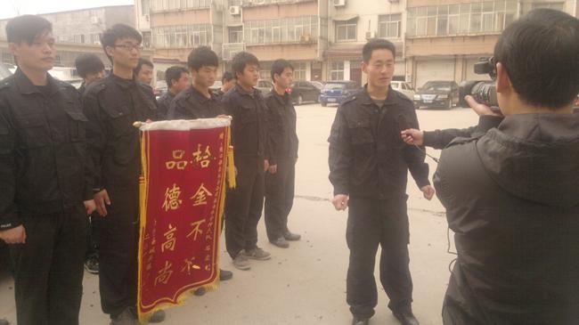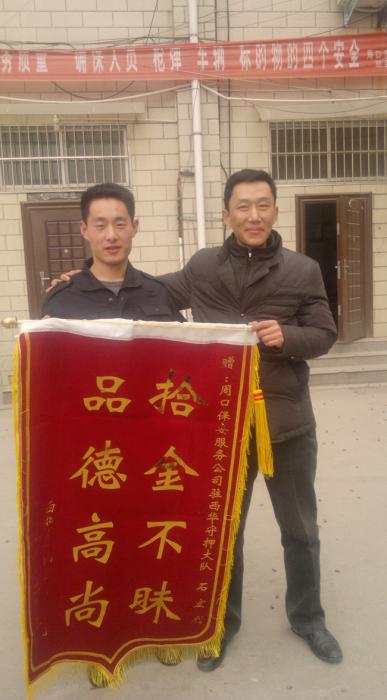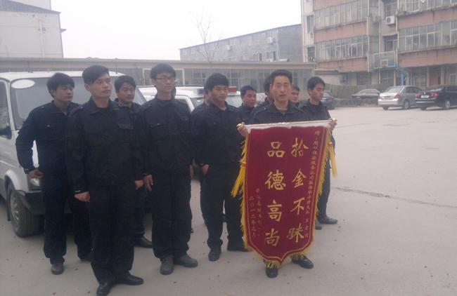 3月12日下午, 周口市保安服務(wù)公司駐西華押運(yùn)大隊(duì)駐地鞭炮齊鳴,一面寫有"拾金不昧,品德高尚"的錦旗被送到該大隊(duì)負(fù)責(zé)人陳思宇的手中,以此表達(dá)對(duì)該大隊(duì)員工拾金不昧的感激之情。