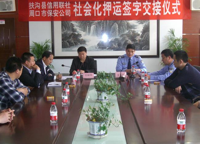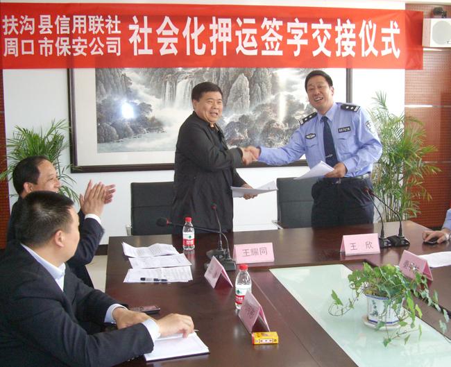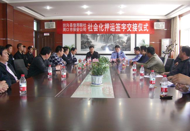4月26日上午,保安公司與在扶溝縣信用聯(lián)社三樓會議室舉行社會化守押交接儀式。周口市公安局治安支隊內(nèi)保大隊長王欣、保安公司副經(jīng)理、押運(yùn)經(jīng)理秦平柱、扶溝縣信用聯(lián)社理事長王耀同、扶溝縣公安局、扶溝銀監(jiān)部門等同志及扶溝押運(yùn)全體守押人員參加交接儀式。