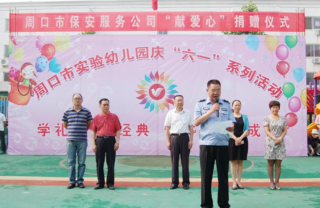 捐贈儀式上,公司黨總支書記鄭明山代表公司總經(jīng)理韓國華向全體小朋友祝福節(jié)日快樂,向全體教師和學(xué)生家長表達祝福,并表示,保安公司一直關(guān)愛社會,關(guān)愛學(xué)校,關(guān)愛祖國的未來,高度重視學(xué)校、幼兒園的安全保衛(wèi)工作,并積極地為推進校園平安建設(shè)服務(wù)。今天,保安公司向市直幼兒園的老師和小朋友們贈送點小禮物,僅表達一點愛心。今后定要總結(jié)經(jīng)驗,把這項“獻愛心”活動組織好,開展好,一年比一年有進步,一年比一年有提高,一年比一年有意義,讓家長更放心,讓小朋友們更開心,讓幼兒園更滿意。