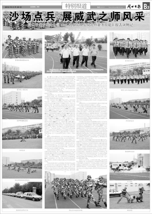 6月27日上午9時,在周口市公安局寬闊的訓(xùn)練場上,蔥綠的草坪更顯生機。“爭做社會治安的巡邏隊,搶險救災(zāi)的突擊隊”、“筑牢社會責(zé)任,服務(wù)平安周口”等巨幅標(biāo)語在充氣氣球的載送下迎風(fēng)飄揚,會場主席臺上方,“周口市保安服務(wù)公司2011式服裝換裝儀式暨業(yè)務(wù)技能匯報表演”的橫幅格外醒目。遠處,場地兩側(cè)有序地擺放著若干軍事訓(xùn)練器械,儀容嚴(yán)整的保安隊員們肅立在訓(xùn)練場一旁。這里,一場氣勢恢宏的業(yè)務(wù)技能練兵匯報演出即將啟幕。