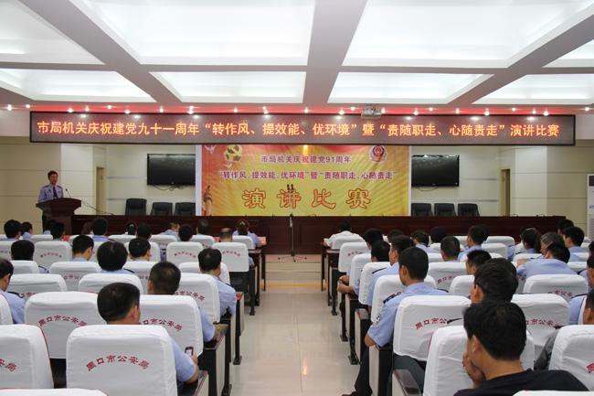 為慶祝中國共產(chǎn)黨成立91周年,深入推進(jìn)市局機(jī)關(guān)“轉(zhuǎn)變作風(fēng)、優(yōu)化環(huán)境”、“責(zé)隨職走、心隨責(zé)走”主題教育活動(dòng),6月29日下午,市局機(jī)關(guān)在三樓會(huì)議室舉行慶祝建黨91周年“轉(zhuǎn)作風(fēng)、提效能、優(yōu)環(huán)境”暨“責(zé)隨職走、心隨責(zé)走”演講比賽。市局黨委委員、警校校長(zhǎng)高華章同志,市局黨委委員、副局長(zhǎng)、紀(jì)委書記楊杰同志等領(lǐng)導(dǎo)觀看比賽并為獲獎(jiǎng)選手頒獎(jiǎng)。
