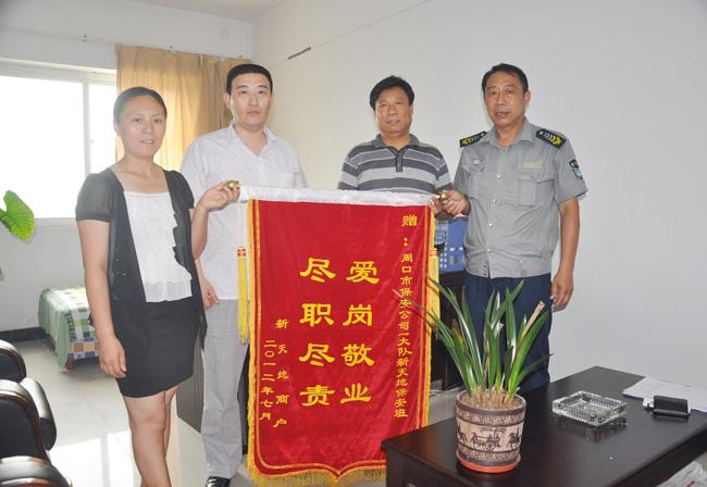 7月9日上午,新天地商戶岳先生及家屬將一面刻有“愛崗敬業(yè)盡職盡責(zé)”的錦旗送到保安公司,表達(dá)對(duì)公司保安的感激之情。