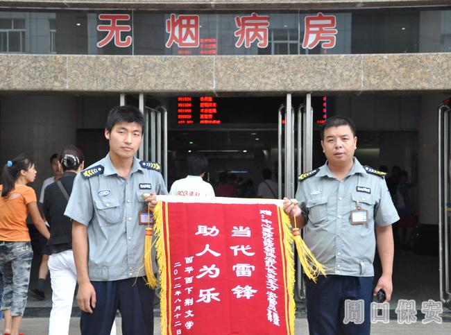 為表達(dá)對保安人員及保安公司的感激之情,靳先生專程從西華老家又一次來到市中心醫(yī)院保安執(zhí)勤崗點(diǎn),將一面繡有"當(dāng)代雷鋒,助人為樂"的錦旗送給執(zhí)勤保安。