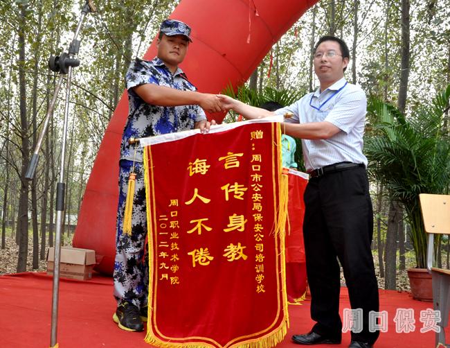 會上,職業(yè)技術學院領導將一面寫著“言傳身教 誨人不倦”的錦旗贈送保安公司培訓學校教官,表達了對參訓教官的敬意。