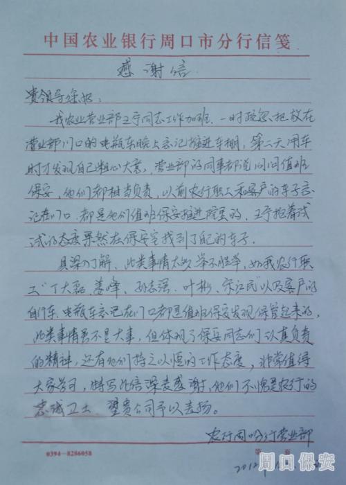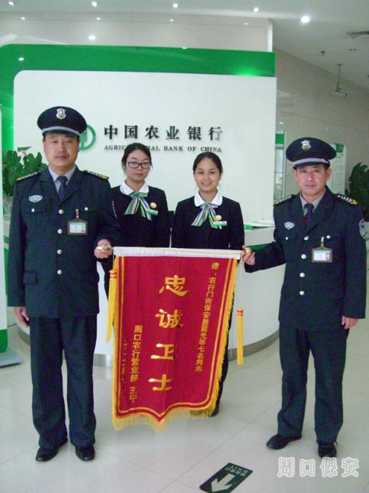 2012年10月29日,周口市保安服務(wù)公司院內(nèi)鞭炮齊鳴,來(lái)自我市中國(guó)農(nóng)業(yè)銀行某行點(diǎn)的王寧向保安公司送來(lái)了錦旗和感謝信致謝。