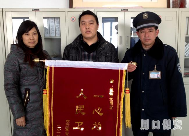 2012年12月4日,周口市保安公司收到了來自中國農(nóng)業(yè)銀行周口分行直屬支行客戶部經(jīng)理鄭萍的一封感謝信和一面繡有“一心為民 人民衛(wèi)士”的錦旗,信中高度表揚了該支行值班保安員蓋霞光忠心為行、全心為民、對工作認(rèn)真負(fù)責(zé)的優(yōu)秀品行。
