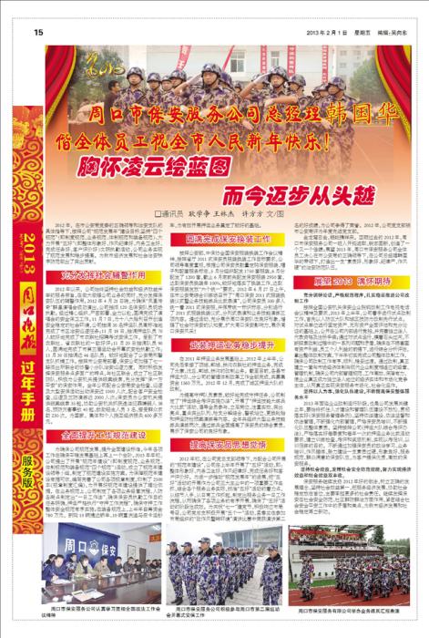 金龍駕云去,銀蛇攜祥來(lái)?;仡欉^(guò)去的2012年,周口市保安服務(wù)公司一班人開(kāi)拓進(jìn)取、銳意圖新,創(chuàng)造了一個(gè)又一個(gè)佳績(jī);展望2013年,周口市保安服務(wù)公司全體員工決心在市公安局的正確領(lǐng)導(dǎo)下,在公司總經(jīng)理韓國(guó)華的帶領(lǐng)下,打造出一支“素質(zhì)好、形象好、紀(jì)律嚴(yán)、作風(fēng)硬”的治安防范隊(duì)伍。