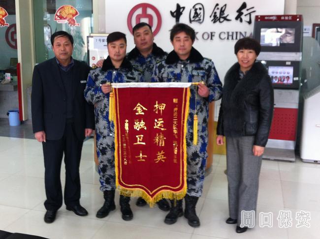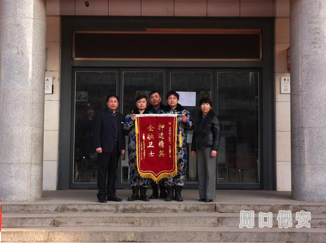 近日中國銀行股份有限公司項城支行馬行長、陳主任送來一面書有“押運精英、金融衛(wèi)士”送到了押運二大隊李飛、張紅雷手里。表達了對公司押運二大隊的管理規(guī)范、優(yōu)質(zhì)服務(wù)的工作肯定和感激之情。