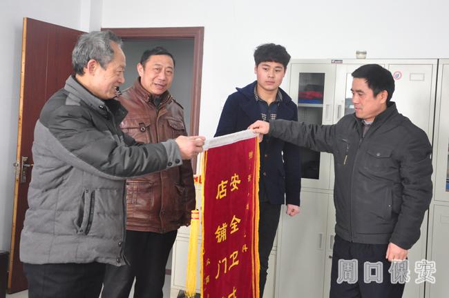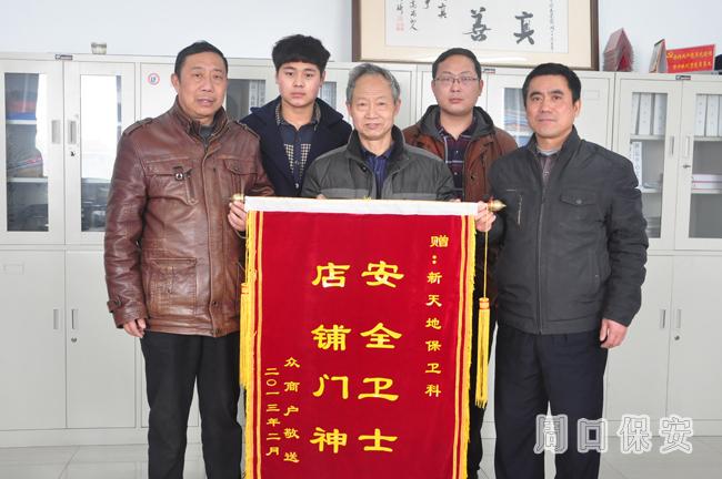 近日周口市新天地商戶賀成風(fēng)與眾商戶將一面錦旗送到周口市保安服務(wù)公司辦公室主任王林杰的手里。