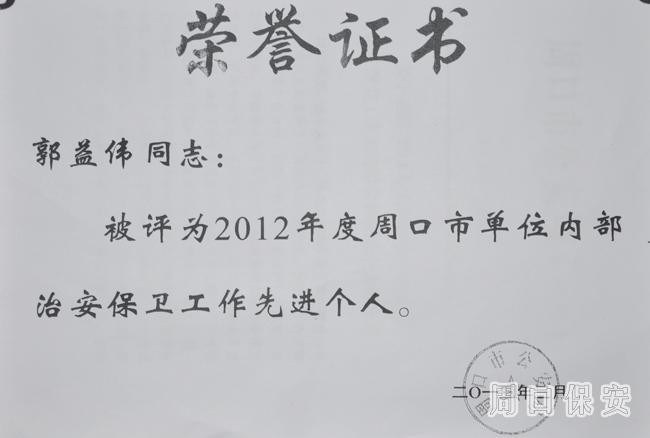 《關(guān)于表彰2012年度全市單位內(nèi)部治安保衛(wèi)工作先進集體、先進個人的決定》,授予我單位郭益?zhèn)ネ緸椤?012年度全市單位內(nèi)部治安保衛(wèi)工作先進個人”稱號。
