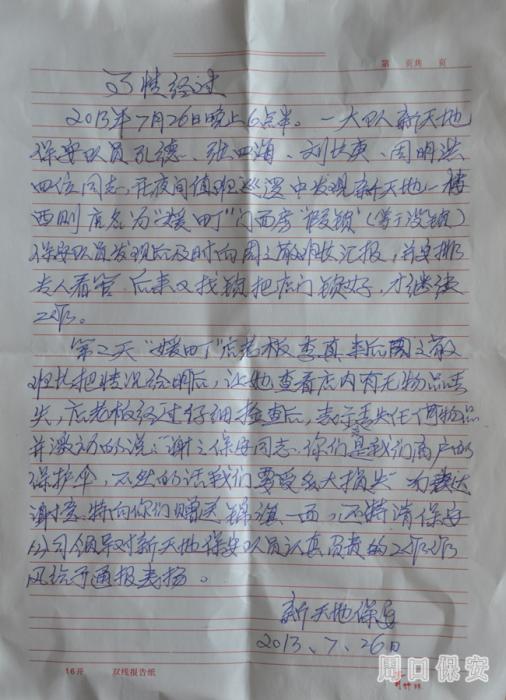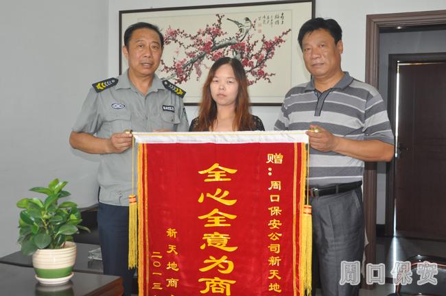 2013年7月31日,周口市新天地商戶李真來到保安公司,送來一面繡有“全心全意為商戶服務(wù)”的錦旗和一封感謝信,大力贊揚(yáng)保安服務(wù)公司駐新天地保安員孔德、張四海、劉長庚、周明鴻四名隊(duì)員工作認(rèn)真負(fù)責(zé)、無私服務(wù)客戶的精神。